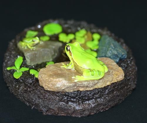オタマジャクシから小さなカエルになり、やがて大人に成長し旅をする、そんな様子を小さなジオラマにしてみました。