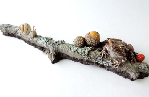 地衣類のついた小枝や木の実などリアルに再現しました。