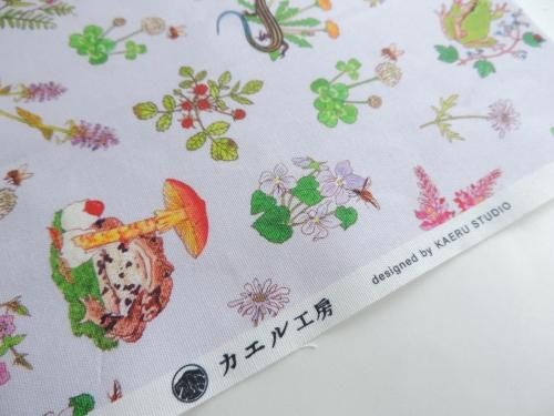 アマガエル、ヒキガエル、ニホントカゲや虫、野の花の布です。